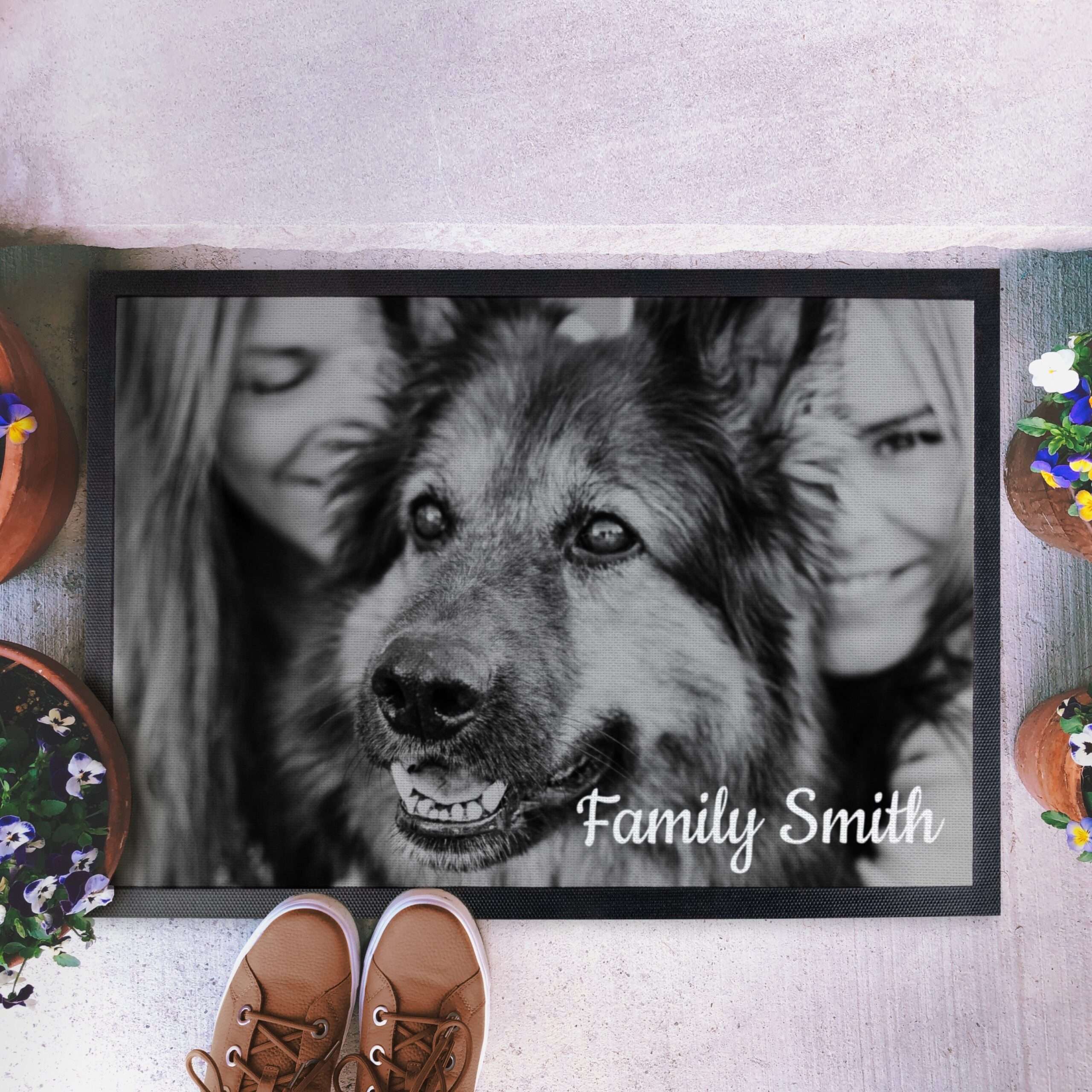 Fußmatte selbst gestalten mit deinem Foto und Text!Familie, Freunde und andere Besucher auf eine ganz besondere Weise Willkommen heißen, oder einfach nur dein Haus schöner gestalten? Eine Fußmatte personalisiert mit deinem Foto und Text? Das ist einfacher als du denkst. Du kannst die Fußmatte selbst entwerfen, so kreierst du ein ganz besonderes Accessoire für deine Wohnung. Die Fußmatte ist von hochwertigem Polyester gefertigt und hat eine hübsche Filzausstrahlung.Wähle im Editor eines der schönen Designs aus, lade dein Foto hoch und füge deinen eigenen Text hinzu. Die Fußmatte hat einen Filzlook und besteht aus hochwertigem Polyester. Solch eine personalisierte Fußmatte passt überall hin und sorgt für eine angenehme Atmosphäre! Auch eine Fußmatte, personaliisert mit Logo am Eingang deines Unternehmens, ist eine schöne Visitenkarte.