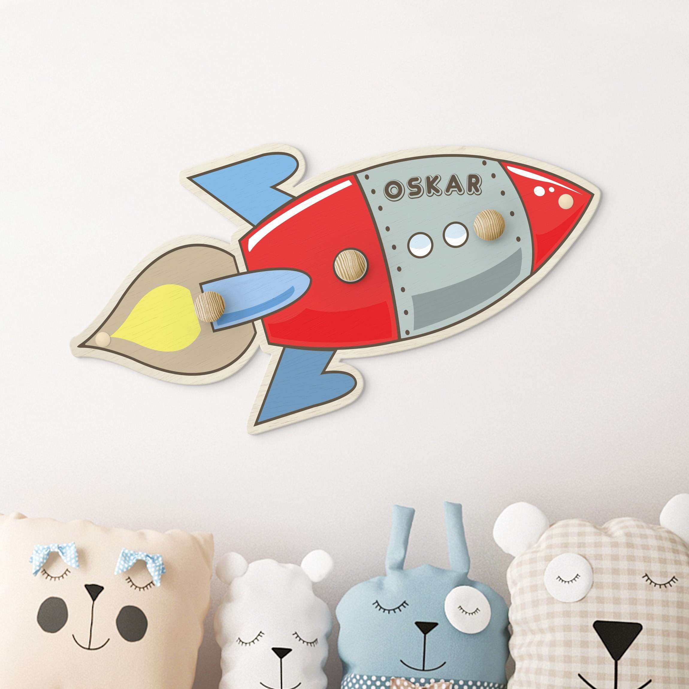 Kindergarderobe Holz mit Namen Rakete rot blau mit Wunschnamen