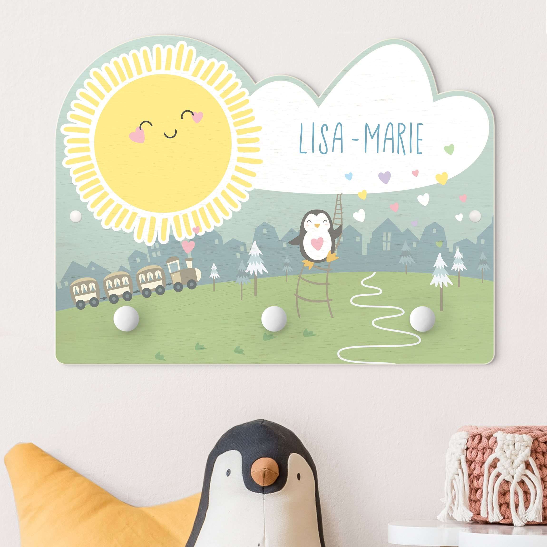 Kindergarderobe Holz mit Namen Sonnenschein und Herzregen mit Wunschname