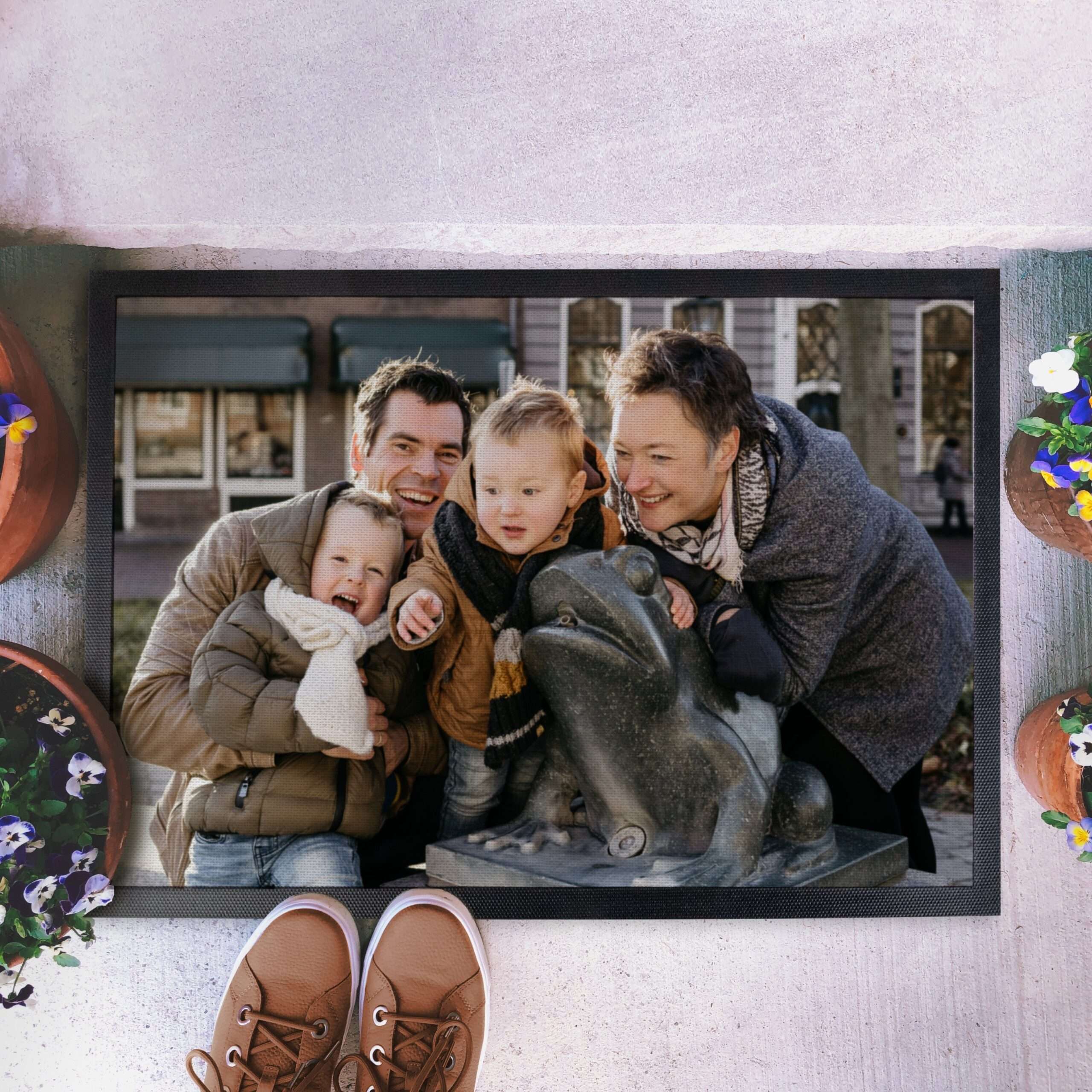Eine einzigartige personalisierte Fußmatte, um deine Gäste stilvoll zu begrüßenHinterlasse einen unvergesslichen ersten Eindruck mit einer personalisierten Fußmatte, die so einzigartig ist wie dein Zuhause. Ob als Highlight für deinen Eingangsbereich oder als besonderes Geschenk zur Einweihung – mit unseren Fußmatten kannst du deinen individuellen Stil zum Ausdruck bringen. Gestalte sie ganz nach deinen Wünschen, ob mit einem Lieblingsfoto, einem persönlichen Text oder einem einzigartigen Design. Egal, ob du eine Fußmatte mit Namen, Logo oder Bild wählst, sie ist nicht nur praktisch, sondern auch ein echter Blickfang für jedes Zuhause.Perfekte Größe für deinen EingangsbereichDie Gestaltung deiner Fußmatte macht Spaß und ist ganz einfach! Wähle aus verschiedenen Größen wie 60x40cm, 75x50cm, 90x60cm oder 105x70cm die passende für deinen Raum aus. Ob Foto, Text, Name, Design oder Logo – du kannst deine Fußmatte bedrucken lassen, so dass sie genau zu dir und deinem Stil passt.Hochwertige Materialien: Von Kunden geliebt!Unsere Fußmatten bestehen aus hochwertigem, saugfähigem Polyester mit einer rutschfesten Gummirückseite. Sie sind für den Innenbereich konzipiert und erfüllen die Brandschutznorm UL94, was für Sicherheit und Langlebigkeit sorgt. Die Oberseite fängt Schmutz und Feuchtigkeit effektiv ab, während die Gummierung dafür sorgt, dass die Matte sicher an Ort und Stelle bleibt.Kunden, die bereits ihre personalisierte Fußmatte gestaltet haben, lieben nicht nur die ausgezeichnete Druckqualität, sondern auch die schnelle Lieferung und den tollen Service. Diese Matten sind die perfekte Wahl für alle, die Funktionalität mit einer persönlichen Note kombinieren wollen. Und das Beste: Sie lassen sich leicht von Hand waschen, damit sie immer wie neu aussehen.Gestalte deine personalisierte Fußmatte noch heute!Ob für dein eigenes Zuhause oder als liebevolles Geschenk – kreiere deine eigene, personalisierte Fußmatte ganz einfach in unserem Online-Editor. Lade dein Foto oder deinen Wunschtext hoch und gestalte eine Matte, die einzigartig ist, genau wie du.Auf der Suche nach weiteren Ideen für Einweihungsgeschenke? Dann schau dir auch unsere originellen und personalisierten Geschenke zur Einweihung an.