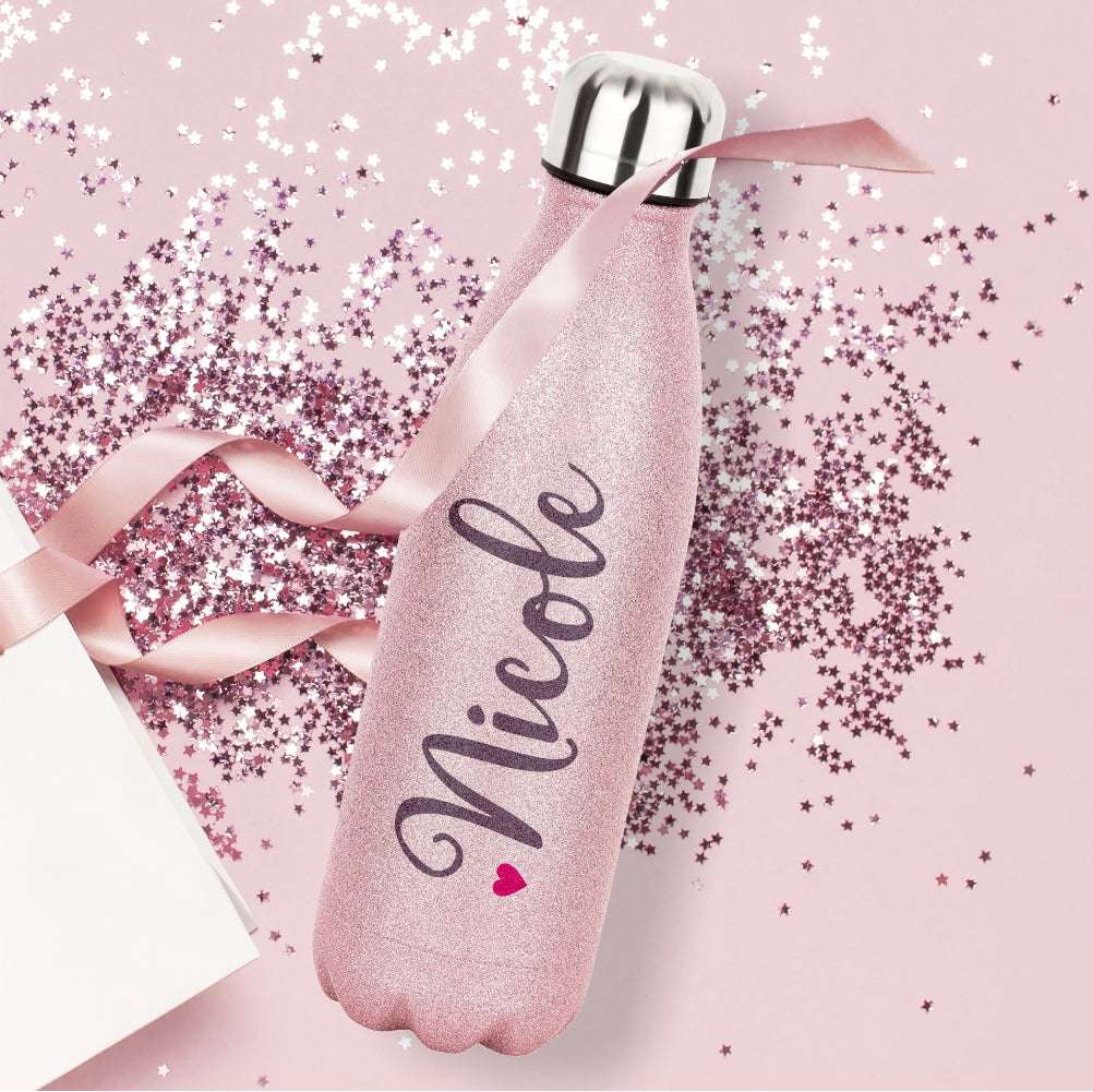 rosa Glitzerflasche mit Herz-Motiv, personalisiert mit Namen