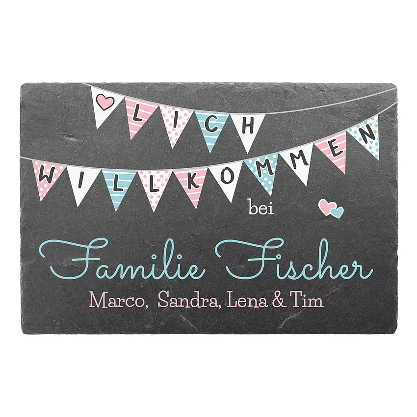 Türschild aus Schiefer „HERZLICH WILLKOMMEN“ mit Personalisierung 30 x 20 cm | blau/rosa