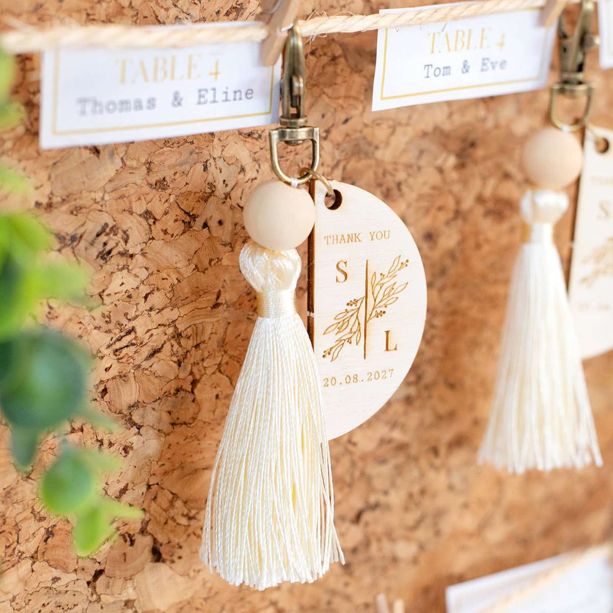 Schaffen Sie das originellste, praktischste und ästhetischste Andenken für Ihr bevorstehendes Ereignis. Dieser schöne Schlüsselanhänger mit Quaste und Holzetikett (6er-Set) ist perfekt, um die Erinnerung an Ihre Zeremonie lebendig zu halten. Personalisieren Sie das Holzetikett mit einem Text Ihrer Wahl und verwenden Sie den Schlüsselanhänger, um eine Botschaft der Freude zu verbreiten. Sie können den Schlüsselanhänger auch mit den Namen und/oder den Daten einer Geburt, Kommunion oder Hochzeit versehen. Mit diesem kreativen Schlüsselanhänger mit bunter Quaste und personalisiertem Etikett können Ihre Gäste ihre Schlüssel leicht identifizieren!